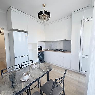 - Просторная кухня-гостиная: угловой гарнитур с большим количеством закрытого хранения, варочная панель на газу, мойка с фартуком под мрамор, холодильник, микроволновая печь, стиральная машина. Обеденная зона с каменной столешницей и стульями. Дизайнерская люстра.