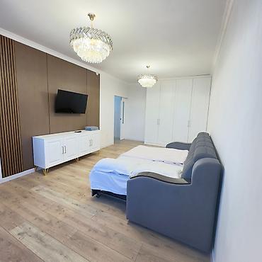 - Спальная/гостиная зона: раскладной диван-кровать, настенный телевизор, тумба-комод на высоких ножках, большой встроенный шкаф-купе. Потолочные люстры с кристаллами, акцентная стеновая панель с рейками.