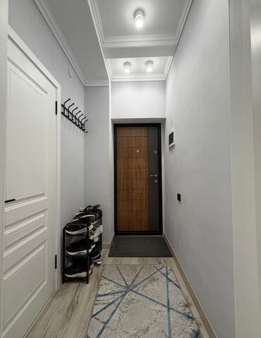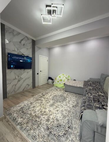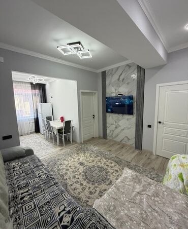 - Ремонт: свежие светло‑серые стены, белые молдинги, натяжные потолки с точечными светильниками и дизайнерскими люстрами. Зона ТВ оформлена плитами под мрамор с вертикальными рейками.