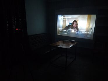 - Домашний кинотеатр: лазерный/LED‑проектор на штативе, проекция на стену, пульт.