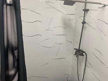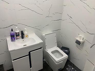 - Санузел: туалет, тумба с раковиной, смеситель, зеркало, полочки, напольная и настенная плитка «под мрамор», держатель для бумаги, ёршик, дозаторы для мыла.