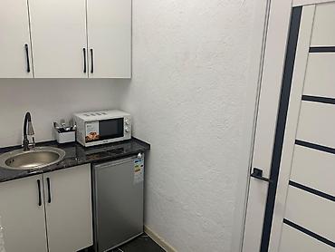 - Кухня: шкафы для хранения, круглая мойка, смеситель с гибким изливом, столешница под камень, микроволновая печь, компактный холодильник, набор столовых приборов.