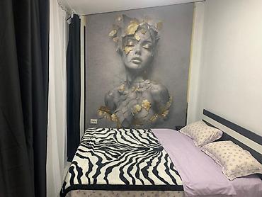 - Интерьер: контрастная отделка в черно-белых тонах, декоративные панели и фотообои, плотные светонепроницаемые шторы, ковёр.