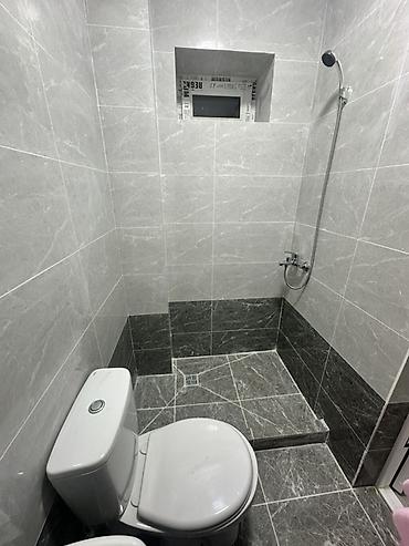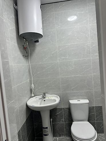 - Санузел в плитке «серый мрамор»: душевая зона с трапом и бортиком, унитаз, раковина на пьедестале, водонагреватель накопительный.