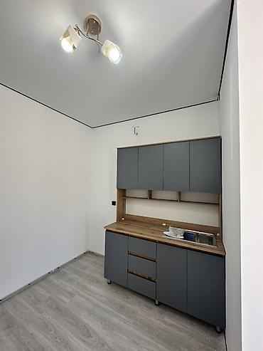 - Отдельная компактная кухня: нижние и верхние модули в матовом сером цвете, столешница под дуб, открытая ниша-фартук, мойка из нержавеющей стали, место под варочную панель и технику.