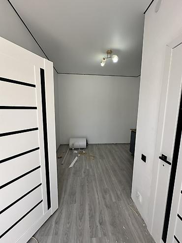 - Комната правильной формы, светлые стены, потолочные светильники, напольное покрытие под дерево (ламинат/ПВХ).