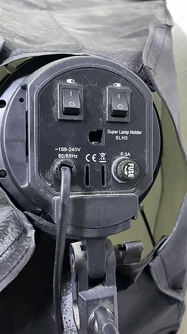 - Патронный блок: Super Lamp Holder SLH3, питание 100–240 В, 50/60 Гц, предохранитель F3A (сменный, доступ через крышку FUSE).