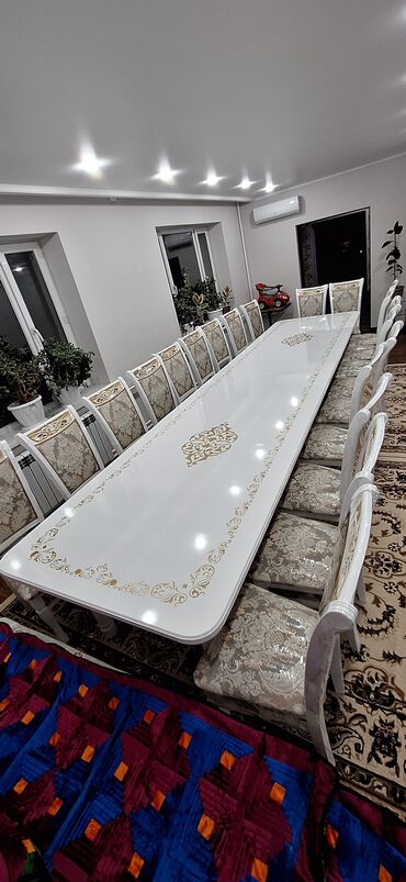 Большой обеденный стол с белой глянцевой столешницей и комплектом из 16 стульев с мягкой обивкой. Ножки стола и каркасы стульев выполнены в светлых тонах с золотистыми декоративными элементами. Сто...