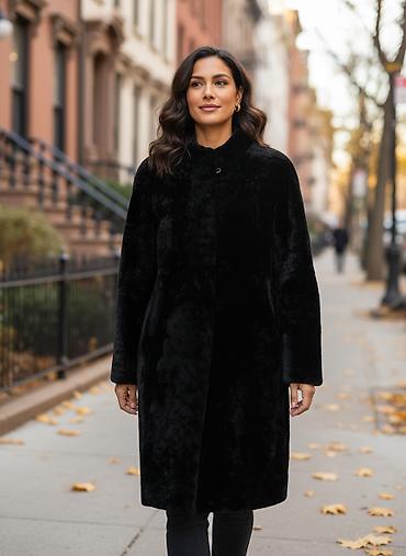 Шуба из натурального меха, классический прямой крой. Цвет: насыщенный тёмно‑коричневый/чёрный с благородным блеском. Длина до середины бедра, длинные рукава. Тёплый воротник‑стойка/полустойка, заст...