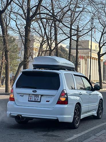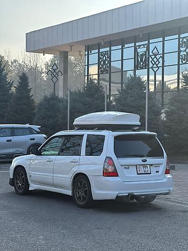 Subaru Forester STI, белый, правый руль. Полный привод, турбированный мотор (воздухозабор на капоте), спортивный обвес и шильдики STI. Легкосплавные диски темного цвета, низкопрофильная резина. Тонированные стекла, черная крыша с рейлингами и установленным аэродинамическим багажным боксом на крыше. Ксенон/линзованные фары, противотуманные элементы в бампере, спойлер на двери багажника, крупный выпускной патрубок. Салон 5‑местный, пять дверей. Номера KG (01 регион).