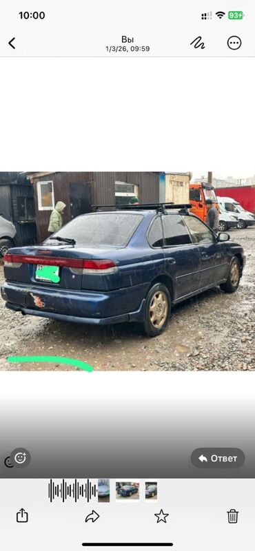 Subaru Impreza седан, правый руль. Темно‑синий цвет, золотые легкосплавные диски. На капоте — воздухозаборник, передний бампер с низкой губой. На крыше установлен багажник/поперечины.