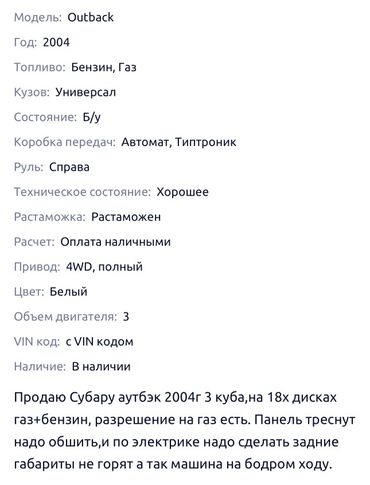 КыргызстанОчень срочно продается Subaru Outback, 2004 г., универсал, правый руль. Двигатель 3.0 л. Топливо: бензин + газ, есть разрешение на газ. Привод полный (4WD). Коробка: автомат/типтроник. Цвет белый с чёрным капотом и крышей. Литые диски R18.