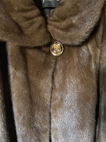 Шуба цельная из норки, темно-шоколадный оттенок. - Крой: прямой, длина миди. - Воротник-стойка. - Застёжка: верхняя декоративная пуговица с золотистым кантом, внутри — скрытые крючки. - Рукава: пр...