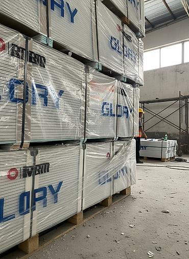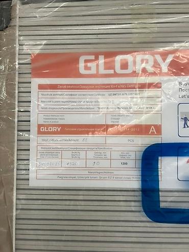 Сухие строительные смеси GLORY в виде панелей, упакованные для транспортировки. Каждая панель имеет размеры 2400x1200 мм и толщину 9.0 мм. Общий вес упаковки составляет 4320 кг. Продукция сертифицирована согласно стандарту UZ.BMT.01.00.75.3257-00 и изготовлена "Special Building Materials Group" МЧЖ. Подходит для различных строительных и отделочных работ.