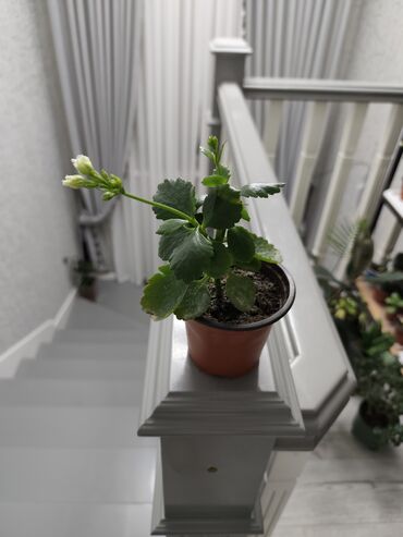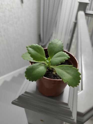- Суккулент каланхоэ (молодое растение) — мясистые зелёные листья с зубчатым краем. Неприхотлив, любит яркий рассеянный свет, умеренный полив с просушкой грунта.
