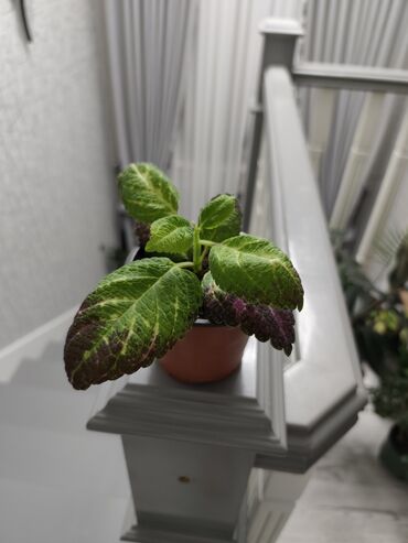 - Комнатный декоративно-лиственный (фиолетово‑зелёная листва с яркими прожилками; похож на пилею/коулес) — эффектные пёстрые листья. Нужен свет без прямого полуденного солнца, умеренный полив, тёплое помещение.