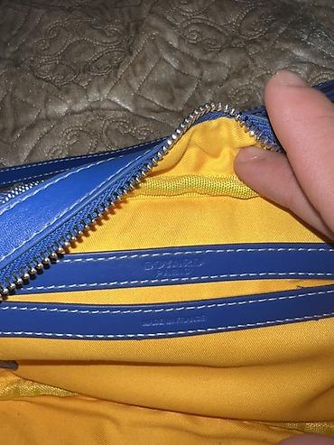 - Цвет: насыщенный синий с монограммным узором; подкладка — ярко‑жёлтая ткань