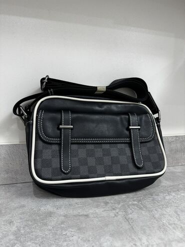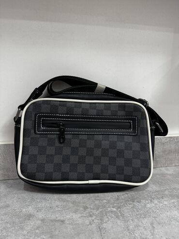 - Материал: плотный текстиль с тёмно‑серым клетчатым рисунком, вставки и низ из искусственной кожи; контрастная светлая окантовка и белая декоративная строчка.