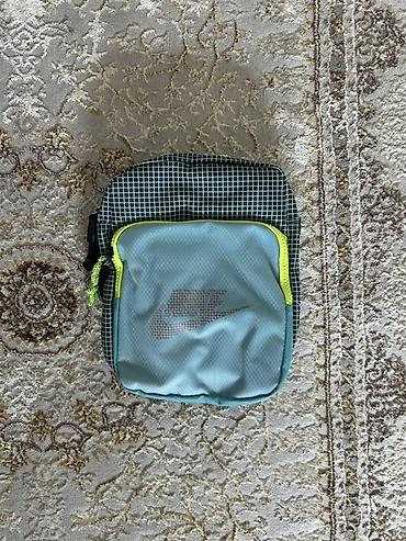 - Цвет: мятно-голубой фронтальный карман с отражающим логотипом Nike; основная часть — тёмно‑зелёная с белой «решёткой»; акценты неонового салатового цвета на молниях и стропе