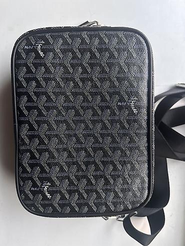 Сумка через плечо, компактный формат. - Цвет: черный/темно‑серый, принт с геометрическим узором по корпусу, контрастная белая строчка. - Материалы: комбинированные — плотный текстильный канвас с у...