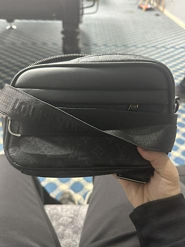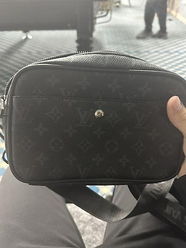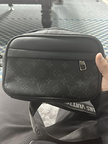 Сумка через плечо в темно‑сером/чёрном тоне с монограммным рисунком. Компактный прямоугольный формат.