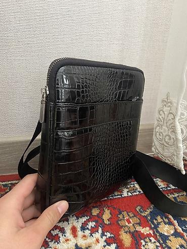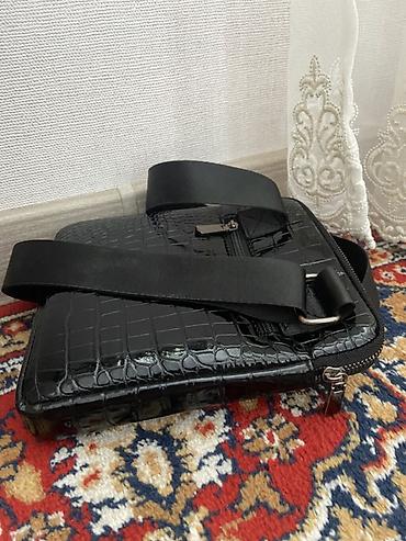 Сумка через плечо, вертикального формата, из глянцевого материала с тиснением под крокодила, черного цвета.