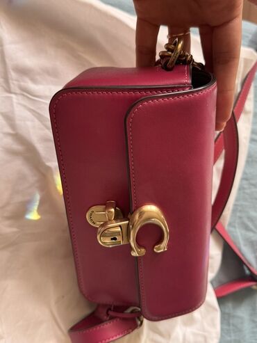 - Фурнитура: металлическая в тёплом оттенке латунного золота, фирменный поворотный замок с элементом в форме подковы, кольца и карабины с гравировкой Coach