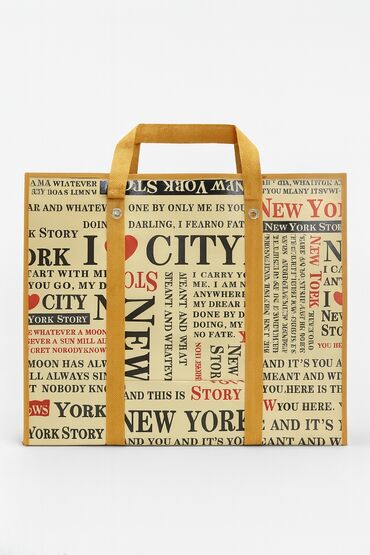 Сумка хозяйственная прямоугольной формы с принтом в виде газетных вырезок с надписями "New York City". Имеет две прочные ручки из плотной ткани жёлтого цвета. Застегивается на молнию, что позволяет...