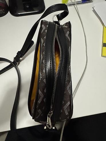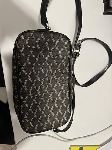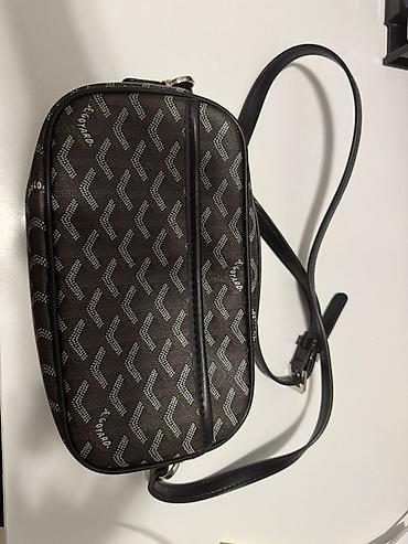 - Материал: покрытый канвас с фирменным геометрическим принтом в тёмно-коричневой гамме, отделка и ремень из чёрной кожи