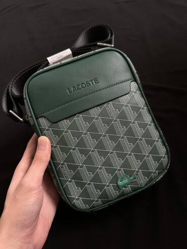 - Цвет: темно‑зеленый с геометрическим монограмным принтом «L» по всей поверхности; фирменный логотип Lacoste с тиснением и эмблема‑крокодил внизу.