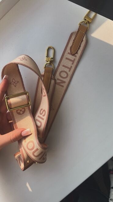 - Комплектация: широкий регулируемый плечевой ремень из текстиля бежево-розового оттенка с кожаными вставками и карабинами, с крупной надписью “LOUIS VUITTON”.