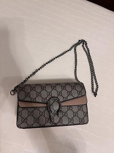 - Материал: плотный канвас с монограммным принтом «GG», отделка гладкой кожей нюдового оттенка по линии клапана.