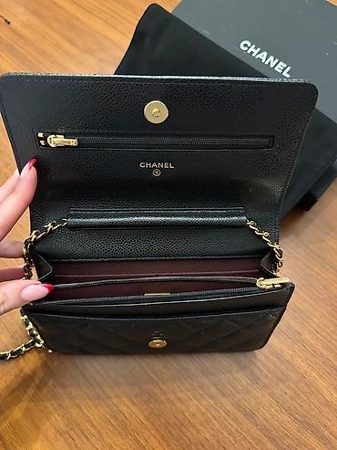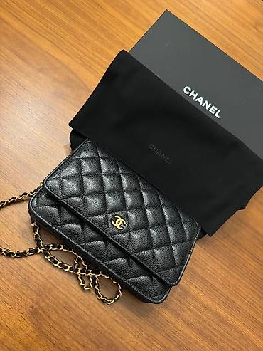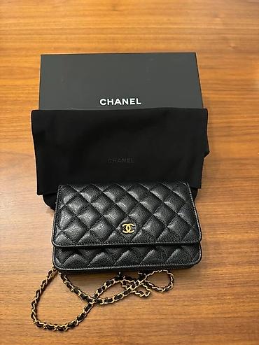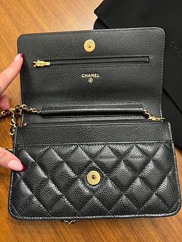 Изготовленный из черной кожи с покрытым одеялом (matelasse) отделкой, он выделяется своим знаменитым золотым логотипом застежки и кожаные ремни цепи, что позволяет носить его через плечо или по всему телу.