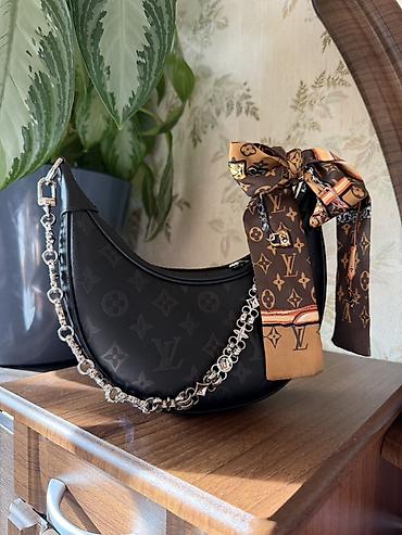 Сумка-седло Louis Vuitton, черная, с тиснённым монограмным рисунком.