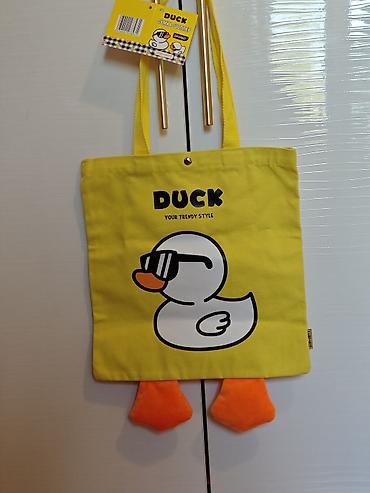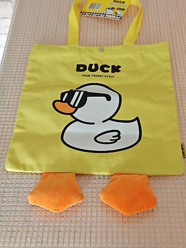 - Яркая жёлтая шоппер-сумка с принтом утёнка в солнечных очках и мягкими объёмными «лапками» внизу