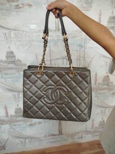 Стеганая сумка-шоппер в сером цвете с золотистой фурнитурой. Модель имеет две ручки, выполненные из комбинации черной кожи и золотистой цепочки, что обеспечивает удобство ношения на плече или в руке. Основное отделение сумки закрывается на молнию. Внутри предусмотрены два основных отделения, разделенные карманом на молнии, а также дополнительный боковой карман на молнии и открытый карман, что позволяет организованно хранить личные вещи. Классический дизайн и практичность делают эту сумку подходящей для повседневного использования и различных мероприятий.