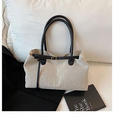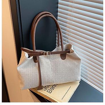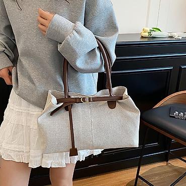 - Материал: фактурный бежевый текстиль; отделка, ручки и ремешок — гладкая экокожа.