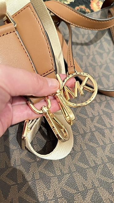 - Дизайн: подвеска-логотип MK на ремешке, металлические полукольца и карабины с гравировкой бренда.