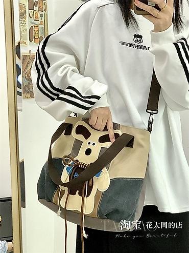 - Дизайн: крупная аппликация собаки спереди, декоративные шнуры и стежка; сбоку — пушистый брелок-медвежонок на карабине.