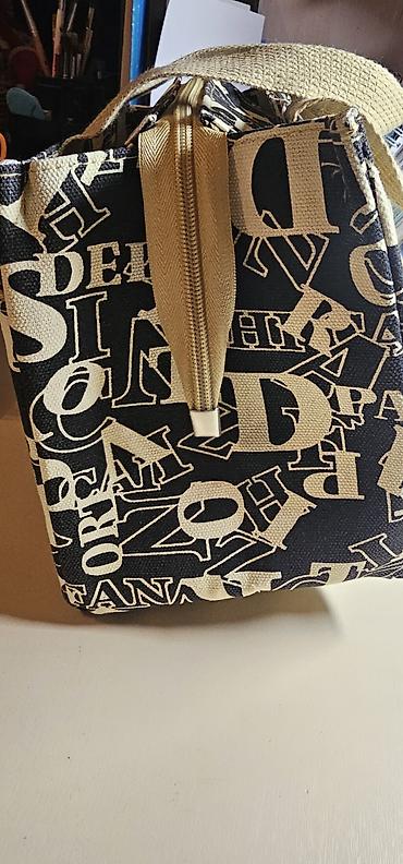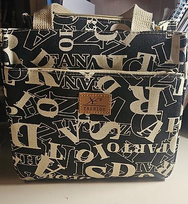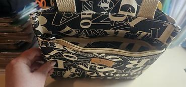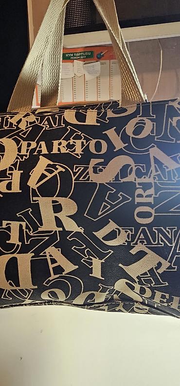 Сумка-шоппер из плотной ткани с абстрактным принтом из крупных бежевых букв на черном фоне. Особенности: - Материал: прочный текстиль (канвас) с фактурным переплетением. - Цветовая гамма: черный ф...