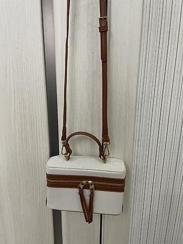 Сумка-тоут/кейс из плотного бежевого текстиля с отделкой из эко-кожи карамельного цвета.