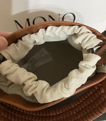 - Детали дизайна: аккуратная строчка, полукруглый профиль, комбинированная фактура (гладкая кожа + плетение) в тёплом коньячном оттенке.