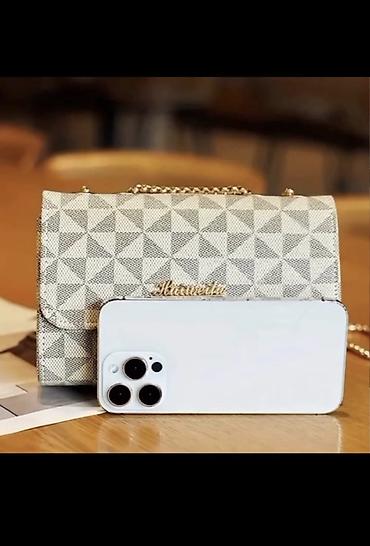 - Светлая модель с геометрическим принтом (треугольники в серо-белой гамме), золотистая фурнитура, декоративная накладная табличка с названием, замок-клапан. Компактный размер — на фото рядом со смартфоном с крупными модулями камеры.