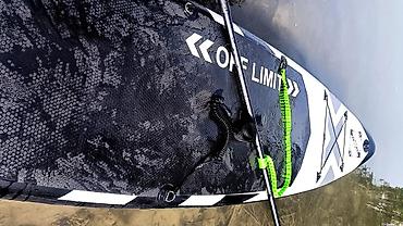 - Комплектация на фото: регулируемое весло, страховочный лиш (спиральный), ремешок/фал ярко‑зеленого цвета, носовой эластичный багажный шнур, D‑кольца для креплений, площадка из нескользящего EVA на палубе, центральная ручка переноса