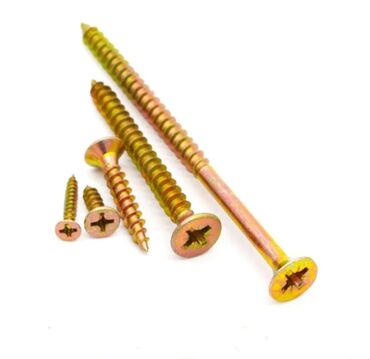 Шурупы для дерева с крестообразным шлицем и потайной головкой, представленные в двух различных размерах. Изделия имеют желтый цинковый цвет, что обеспечивает дополнительную защиту от коррозии и эстетичный вид. Они идеально подходят для надежного крепления деревянных конструкций, мебели, а также для монтажных работ в быту и на производстве. Крепеж обладает острым наконечником и полной резьбой, что облегчает вкручивание и обеспечивает прочное соединение.