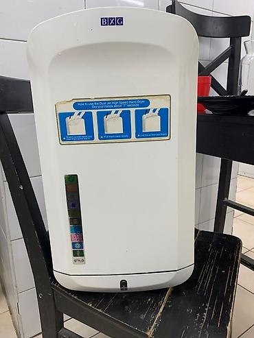 - Высокоскоростная струйная сушилка: руки опускаются в вертикальную камеру, поток воздуха с двух сторон быстро сдувает влагу.