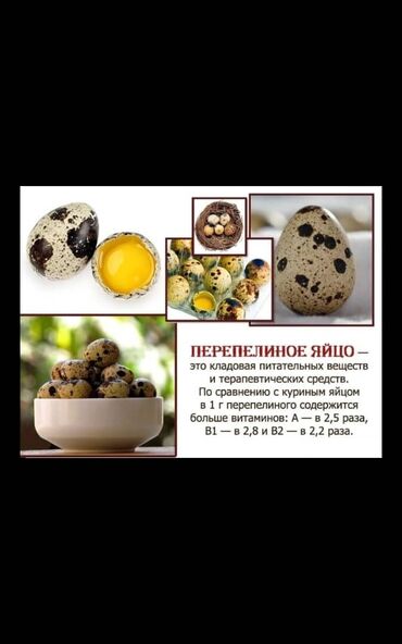 Перепелиные яйца: Перепелиные яйца в лотке: (Есть 12 штучный лоток и 18 штучный лоток). 12 штук-80 сом. 18 штук-10 сом. Перепелиные яйца без лотков: 1 штука-6сом Перепелиные яйца оптом от 10 лотков...