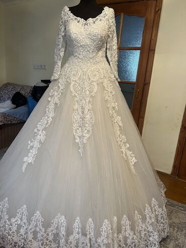 Свадебное платье, L, Без кольца, Закрытое, Фатин, Пышное, Китай, Пайетки, Цветочные элементы, Жемчуг, Б/у
