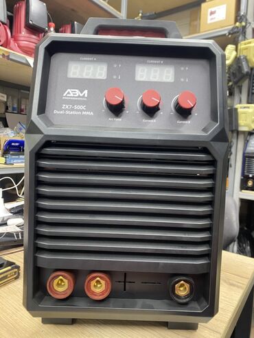 - ABM ZX7-500C Dual‑Station MMA — версия с двумя независимыми станциями (два цифровых индикатора Current A/Current B, отдельные регуляторы Arc Force, Current A, Current B). Две положительные клеммы «+» и одна «−» на лицевой панели.