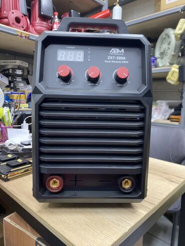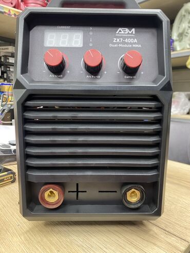 - ABM ZX7-400A Dual‑Module MMA — инвертор с цифровым дисплеем и тремя регуляторами: Arc Start, Arc Force, Current. Выходные клеммы «+»/«−» стандартного быстросъёмного типа, усиленная решётка охлаждения.